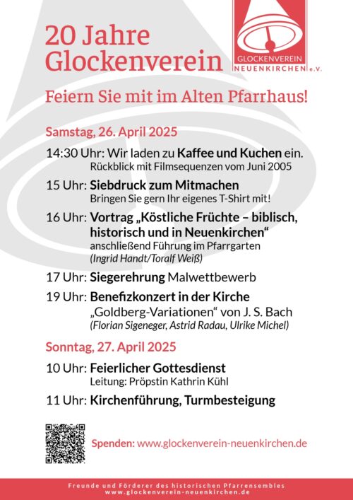 Am letzten Aprilwochenende erwartet Sie anlässlich des 20-jährigen Jubiläums des Glockenvereins eine Reihe von Veranstaltungen.